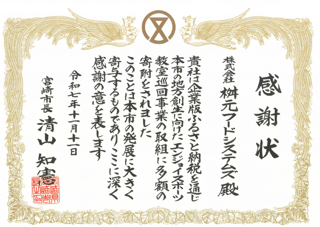 宮崎市より「ふるさと納税寄附貢献事業者」として表彰をいただきました。